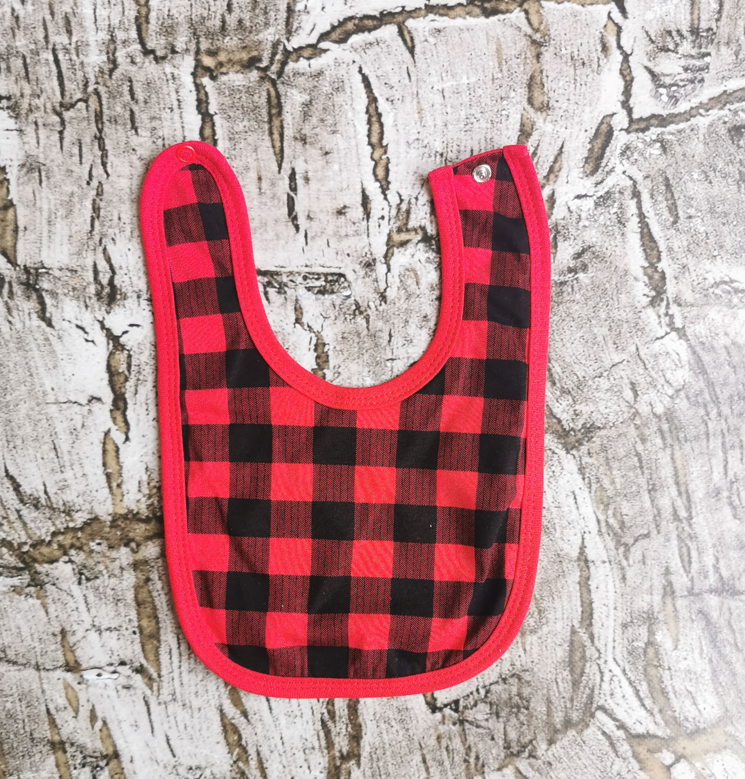 Śliniaczek w czerwono czarną kratę ,zapinany na napkę, 100% bawełna. Polski producent Mrofi.