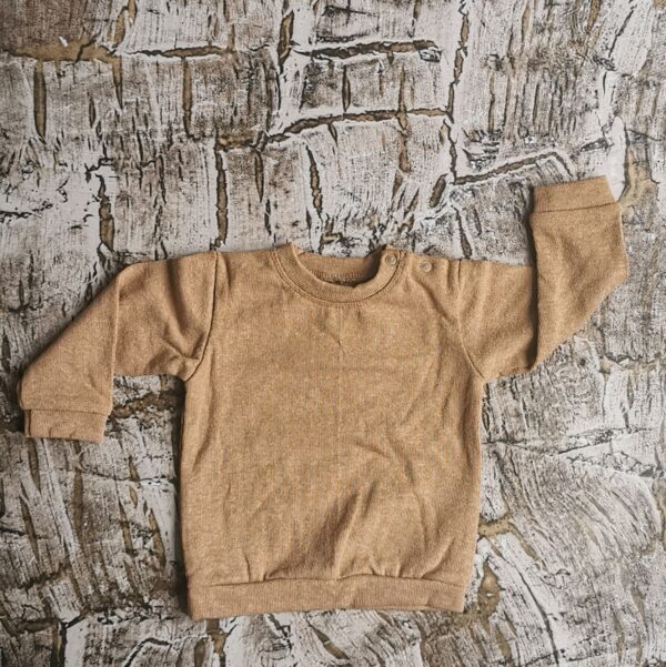 Brązowa bluza miła w dotyku ala sweterek. Bardzo wygodna, na ramieniu bluzki znajdują się napki co ułatwia zakładanie i zdejmowanie bluzeczki. Skład materiału to 55 % bawełna, 40% akryl oraz 5% elastan Polski producent Mrofi.