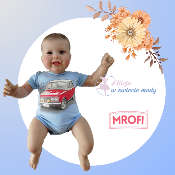 Błękitne body z motywem autka . Skład: 100% bawełna. Polski producent Mrofi.