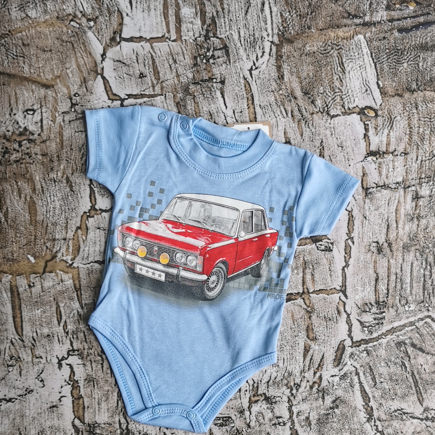 Błękitne body z motywem autka . Skład: 100% bawełna. Polski producent Mrofi.