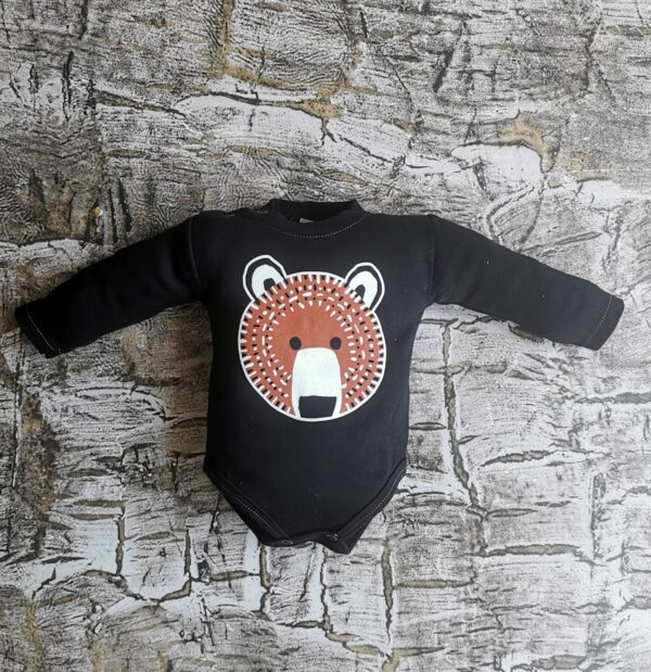 Czarne body z motywem misia . Na ramieniu zapinane na napki co ułatwia ich zakładanie oraz zdejmowanie. Skład: 100% bawełna. Polski producent Mrofi.