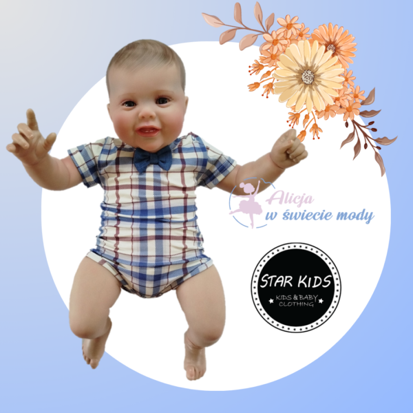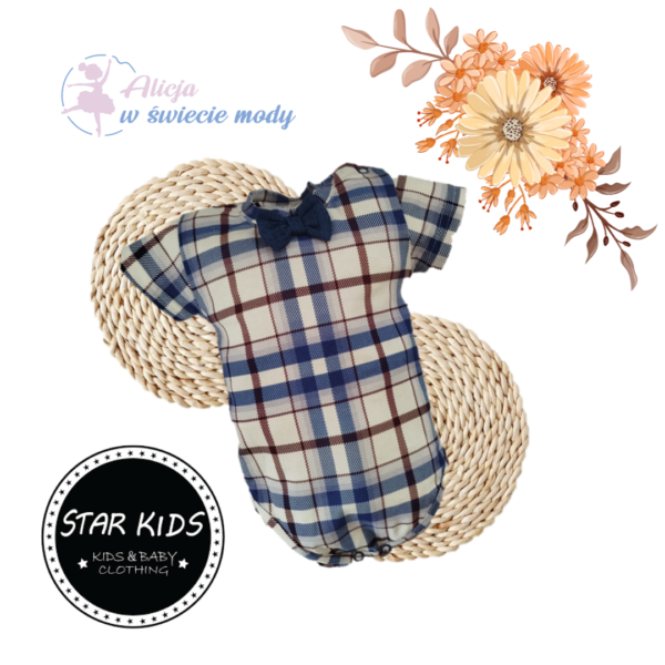 Eleganckie body z motywem bordowo niebieskiej krateczki oraz muchą idealnie dopełnią szykowny look małego eleganta . Skład: 95% bawełna, 5% elastan. Polski producent Star kids.