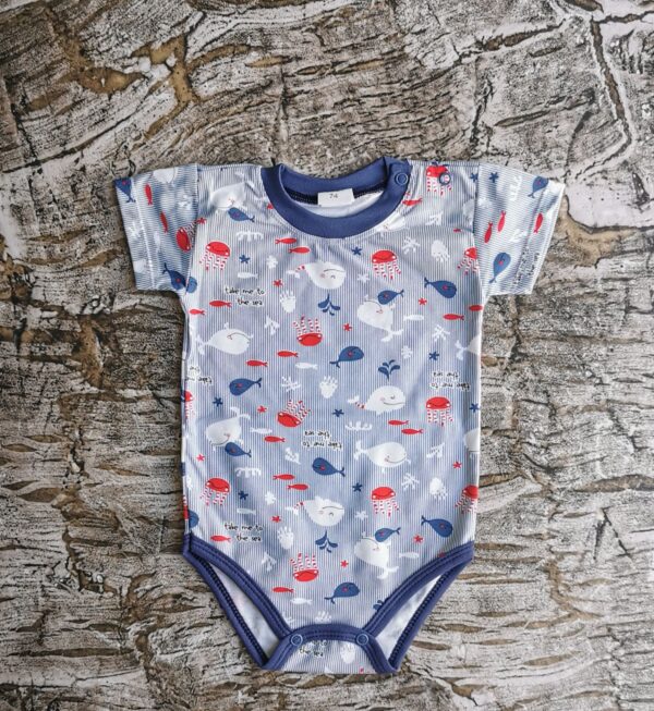 Body z motywem rybek. Na ramieniu zapinane na napki co ułatwia ich zakładanie oraz zdejmowanie. Skład: 95% bawełna 5% elastan. Polski producent Mrofi.