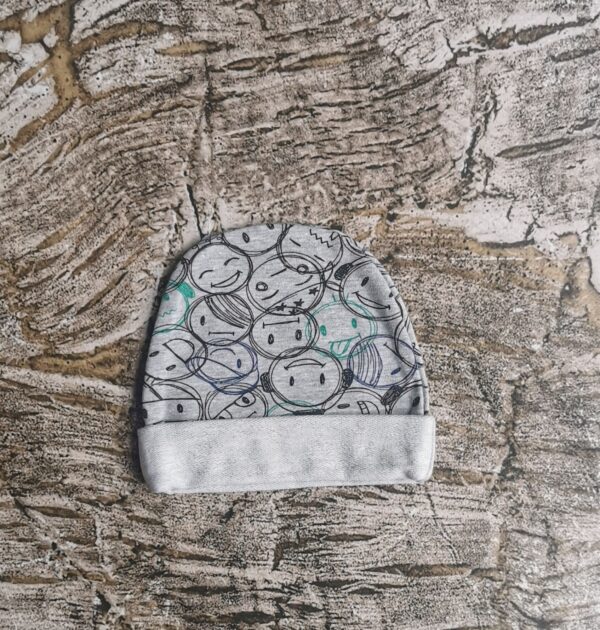 Szara czapka, z motywem emotek. Skład 95% bawełna 5% elastan. Polski producent Mrofi.
