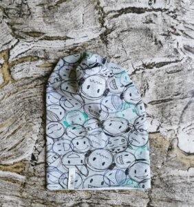 Szara czapka z motywem emotek, miękka i elastyczna. Skład 95% bawełna 5% elastan. Polski producent Mrofi.