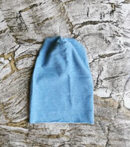 Niebieska czapka, miękka i elastyczna. Skład 95% bawełna 5% elastan. Polski producent Mrofi.
