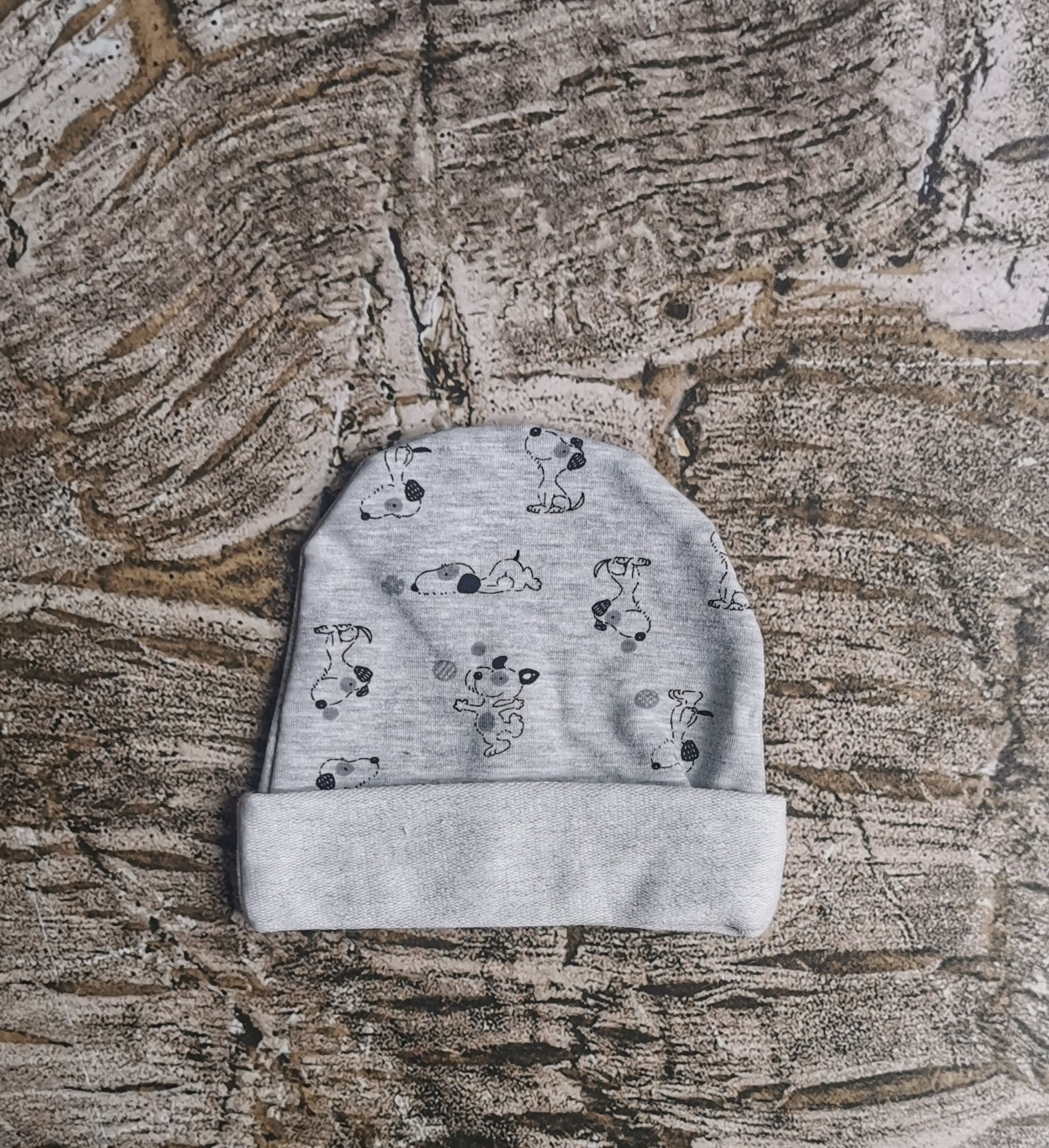 Szara czapka, z motywem piesków. Skład 95% bawełna 5% elastan. Polski producent Mrofi.