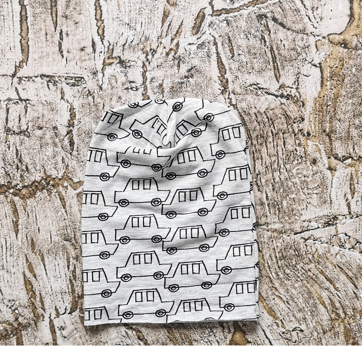 Szara czapka w czarne samochody, miękka i elastyczna. Skład 95% bawełna 5% elastan. Polski producent Mrofi.