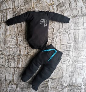 Komplet składa się z body i półśpiochów. Body czarne z napisami na kieszonce oraz czarne półśpiochy . Skład materiału to : body 95% bawełna 5% elastan półśpiochy 100% bawełna Polski producent Mrofi.