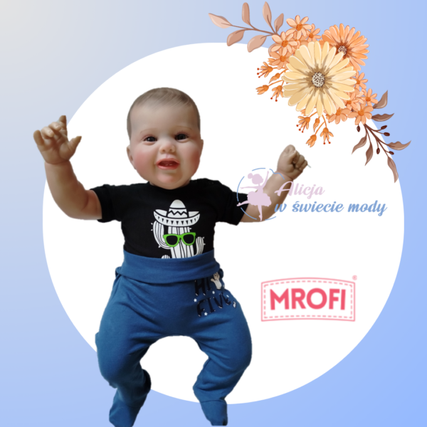 Komplet składa się z body i półśpiochów. Body z motywem kaktusa oraz granatowe półśpiochy . Skład materiału to : body 95%bawełna 5% elastan oraz półśpiochy 100% bawełna. Polski producent Mrofi.