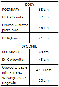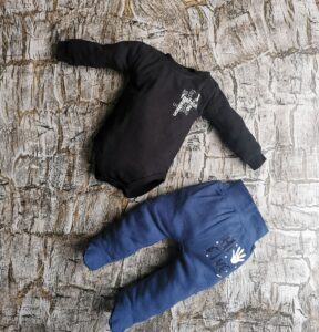 Komplet składa się z body i półśpiochów. Body czarne z napisami oraz granatowe półśpiochy z motywem łapki . Skład materiału to : body 95% bawełna 5% elastan półśpiochy 100% bawełna Polski producent Mrofi.