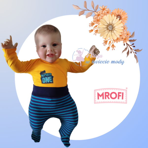 Komplet body i półśpiochy. Body kopertowe z napisem Number one oraz bezuciskowe  półśpiochy w paski . Skład: Body 100% bawełna, półśpiochy 95% bawełna. 5% poliester.Polski producent Mrofi.