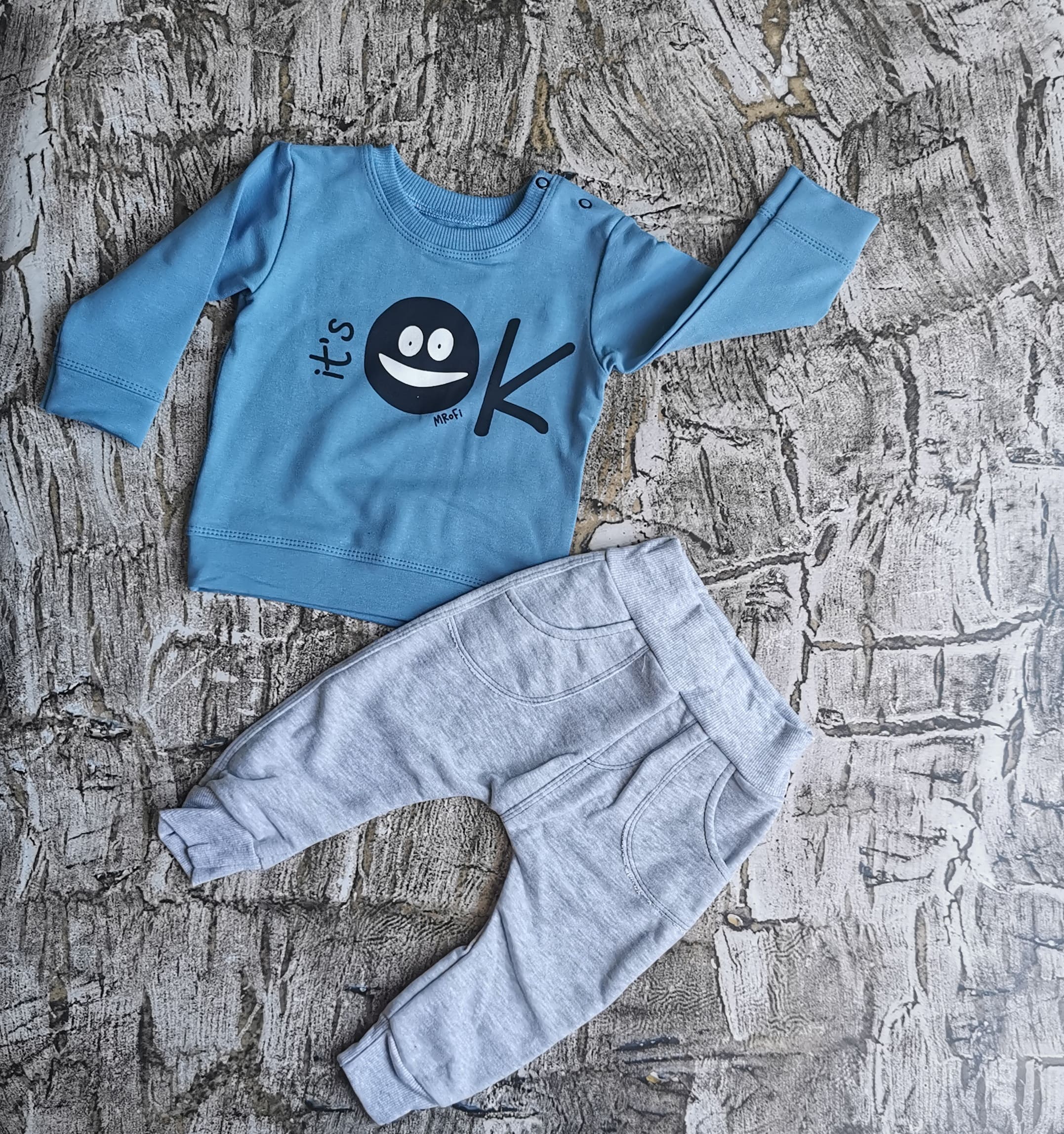 Dresik chłopięcy w modnej kolorystyce, bluza na ramieniu zapinana na napiki co ułatwia jej zakładanie i zdejmowanie . Skład materiału: bluza 95% bawełna oraz 5% elastan, spodnie 95 % baełna i 5 % poliester. Polski producent Mrofi