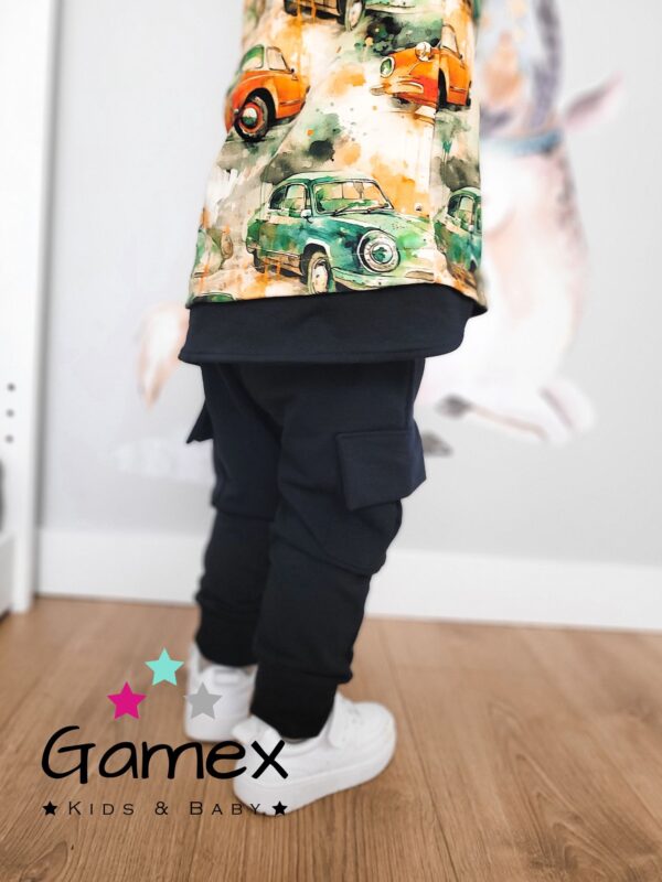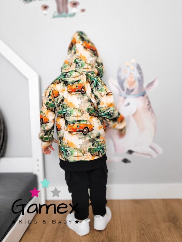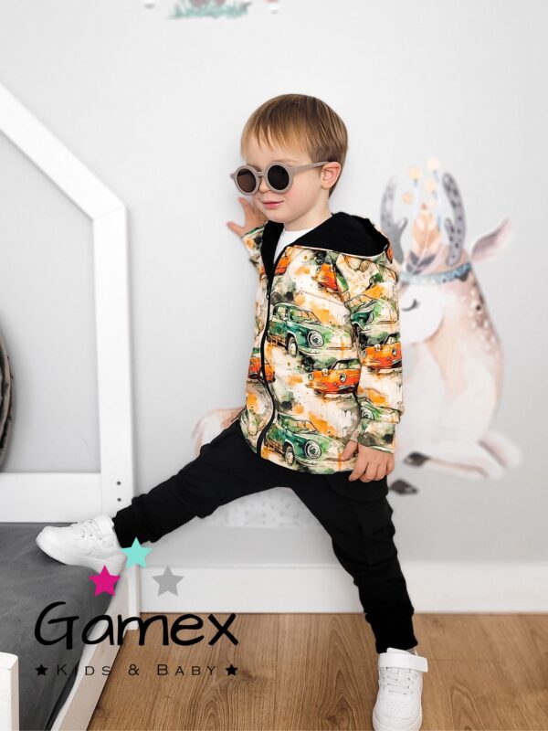 Modny dres z motywem samochodów . Miły w dotyku dresik bluza z kapturem oraz modnym krojem spodni. Skład: 95% bawełna 5% elastan .Polski producent Gamex.