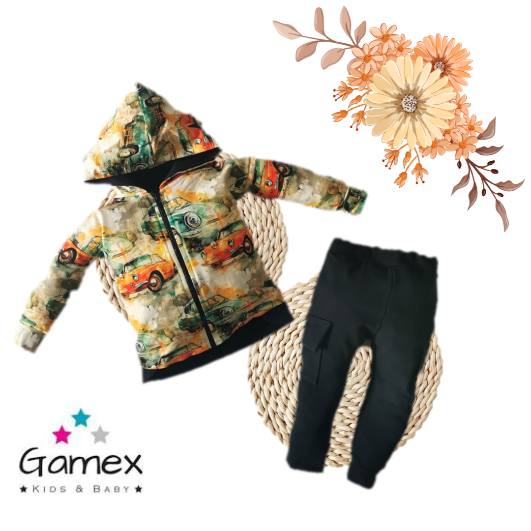 Modny dres z motywem samochodów . Miły w dotyku dresik bluza z kapturem oraz modnym krojem spodni. Skład: 95% bawełna 5% elastan .Polski producent Gamex.