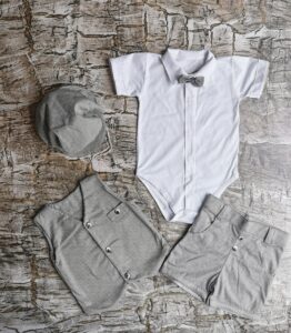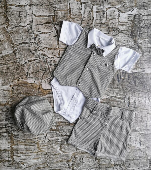 Elegancki komplecik dla chłopca. W komplecie znajdują się: kaszkiet, body, mucha (na gumce-ściągana), kamizelka oraz spodenki. idealny na wszelkiego rodzaju uroczystości typu: chrzciny, roczek, wesele itp. Wykonany został w 100% w Polsce przez producenta Mrofi. Jego skład to: 100% bawełna.