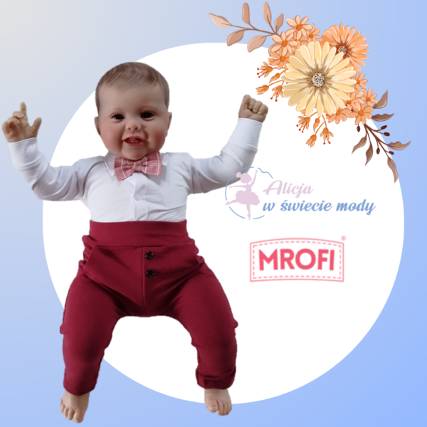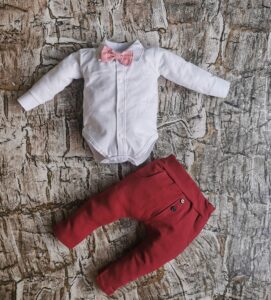 Elegancki komplecik dla chłopca. W komplecie znajdują się: białe body, mucha (na gumce-ściągana) oraz spodnie. idealny na wszelkiego rodzaju uroczystości typu: chrzciny, roczek, wesele itp. Wykonany został w 100% w Polsce przez producenta Mrofi. Jego skład to: body 100% bawełna, spodnie 95% bawełna oraz 5 % elastan.