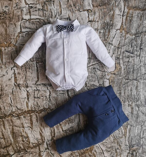 Elegancki komplecik dla chłopca. W komplecie znajdują się: białe body, mucha (na gumce-ściągana) oraz spodnie. idealny na wszelkiego rodzaju uroczystości typu: chrzciny, roczek, wesele itp. Wykonany został w 100% w Polsce przez producenta Mrofi. Jego skład to: body 100% bawełna, spodnie 95% bawełna oraz 5 % elastan.
