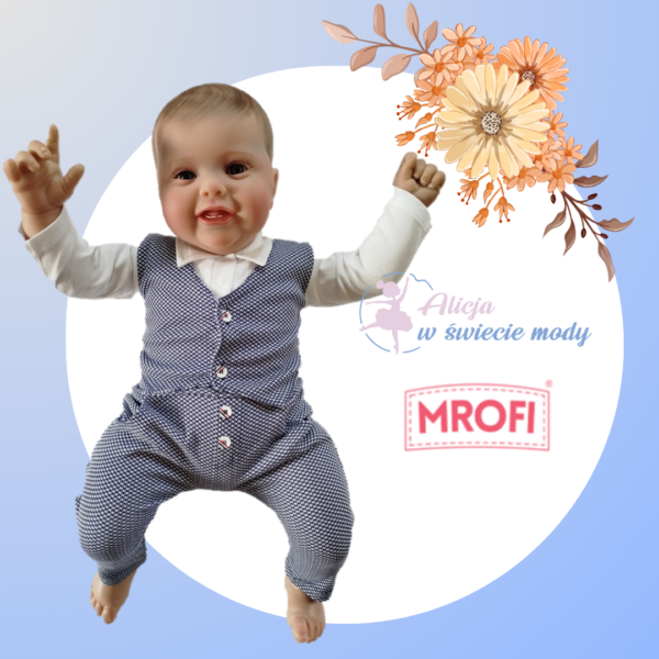 Elegancki granatowy komplecik w białą pepitkę dla chłopca, idealny na wszelkiego rodzaju uroczystości typu: chrzciny, roczek, wesele itp. Wykonany został w 100% w Polsce przez producenta Mrofi. Jego skład to 100% bawełna.