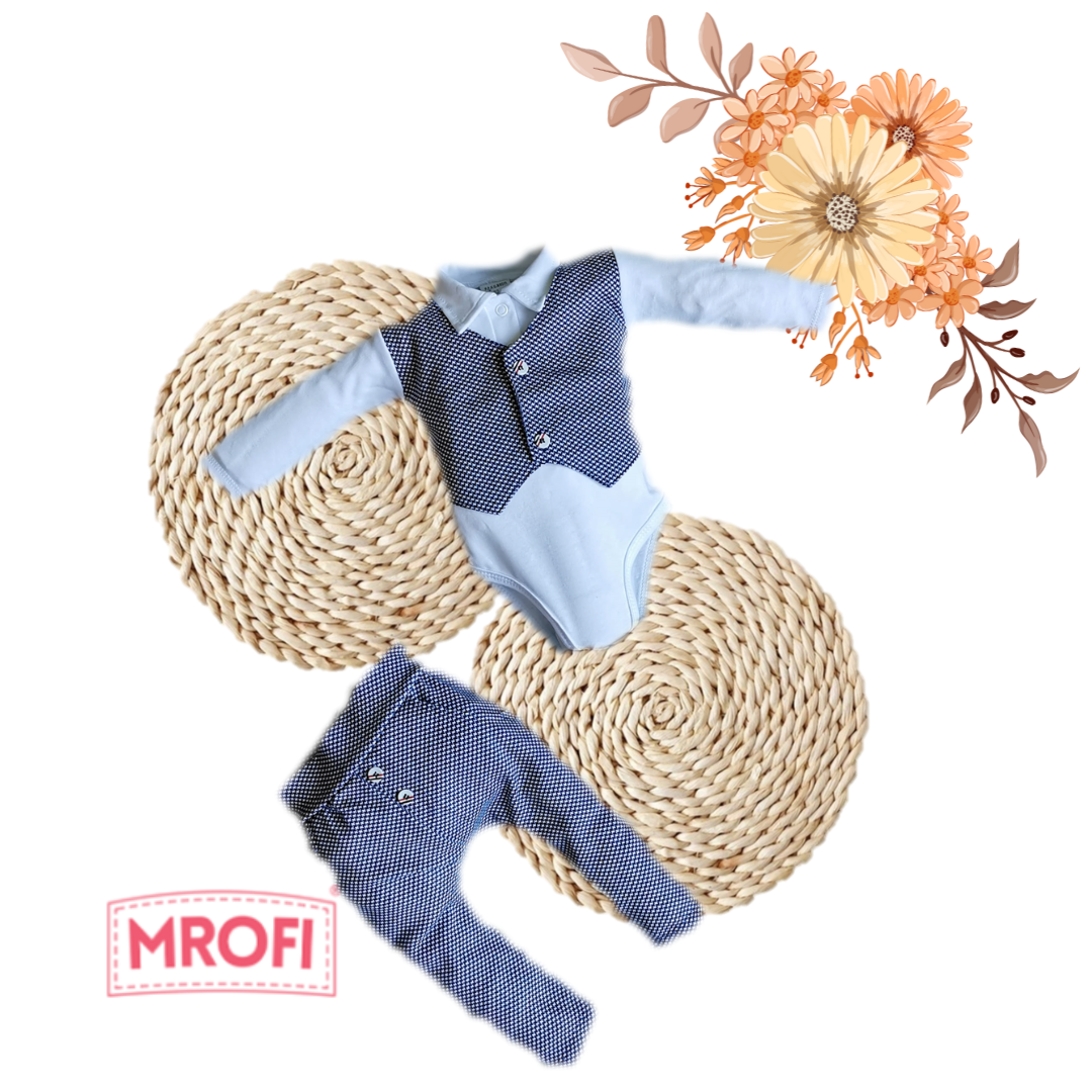 Elegancki granatowy komplecik w białą pepitkę dla chłopca, idealny na wszelkiego rodzaju uroczystości typu: chrzciny, roczek, wesele itp. Wykonany został w 100% w Polsce przez producenta Mrofi. Jego skład to 100% bawełna.