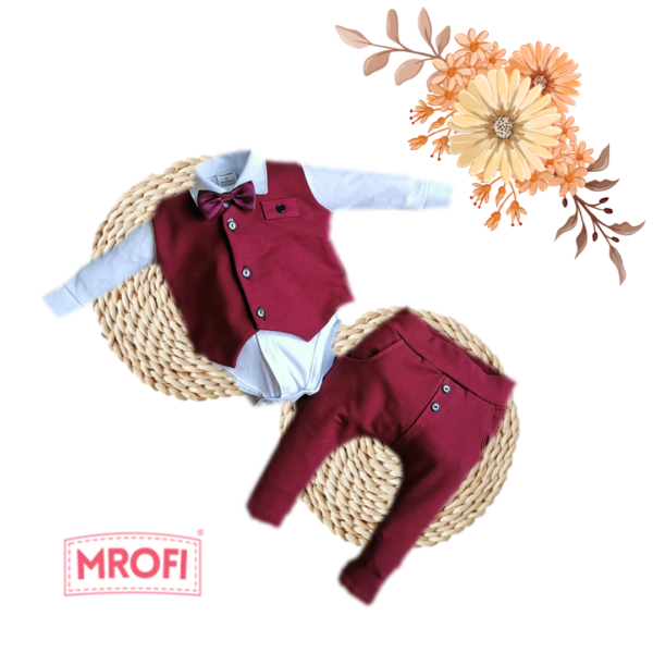 Elegancki komplecik dla chłopca. W komplecie znajdują się: body, mucha (na gumce-ściągana bordowa), kamizelka oraz spodnie w kolorze bordowym. idealny na wszelkiego rodzaju uroczystości typu: chrzciny, roczek, wesele itp. Wykonany został w 100% w Polsce przez producenta Mrofi. Jego skład to: body 100% bawełna, kamizelka oraz spodnie 95% bawełna oraz 5 % elastan. W rozmiarze 98cm komplecik składa się: z białej koszuli , muchy ,kamizelki i spodni.