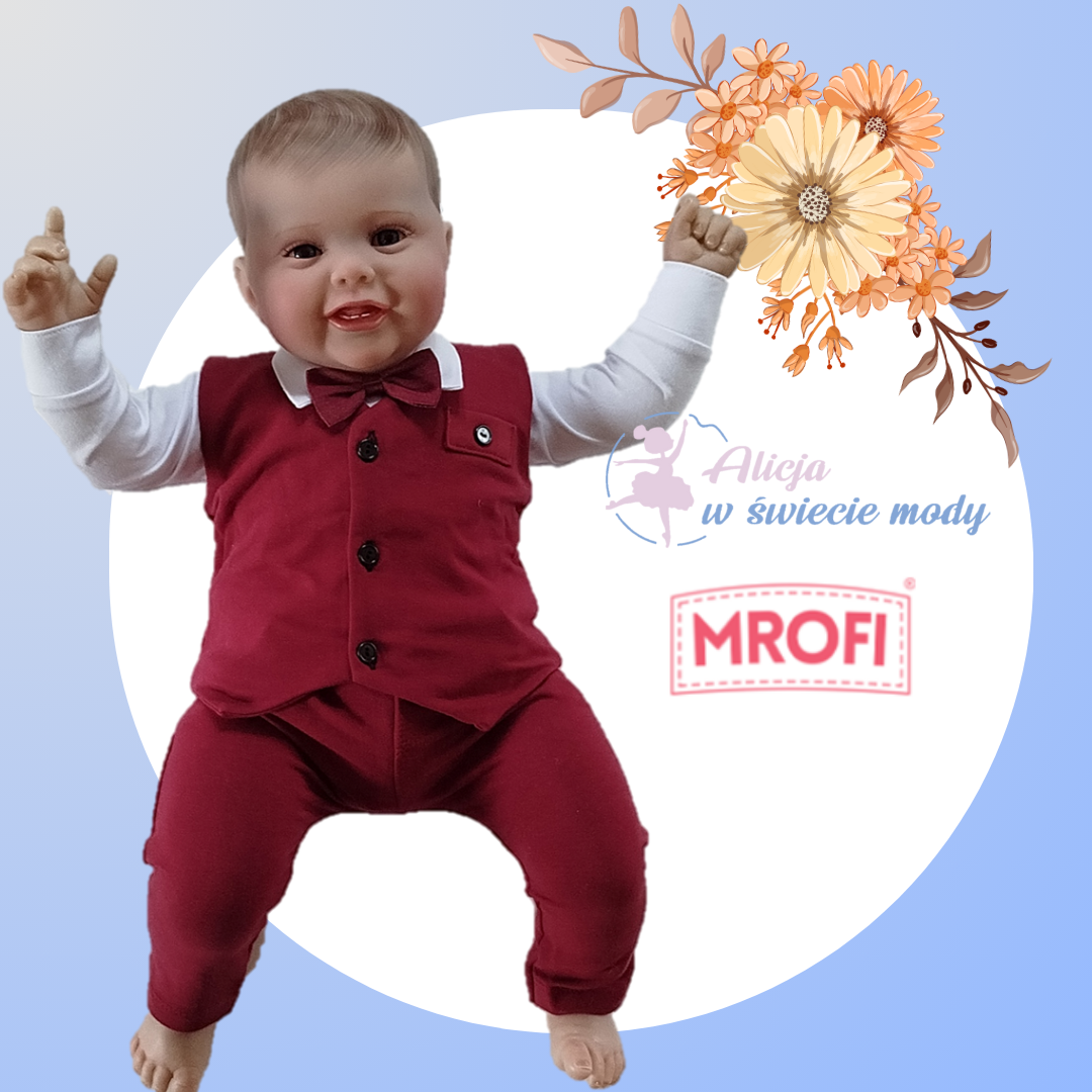 Elegancki komplecik dla chłopca. W komplecie znajdują się: body, mucha (na gumce-ściągana bordowa), kamizelka oraz spodnie w kolorze bordowym. idealny na wszelkiego rodzaju uroczystości typu: chrzciny, roczek, wesele itp. Wykonany został w 100% w Polsce przez producenta Mrofi. Jego skład to: body 100% bawełna, kamizelka oraz spodnie 95% bawełna oraz 5 % elastan. W rozmiarze 98cm komplecik składa się: z białej koszuli , muchy ,kamizelki i spodni.
