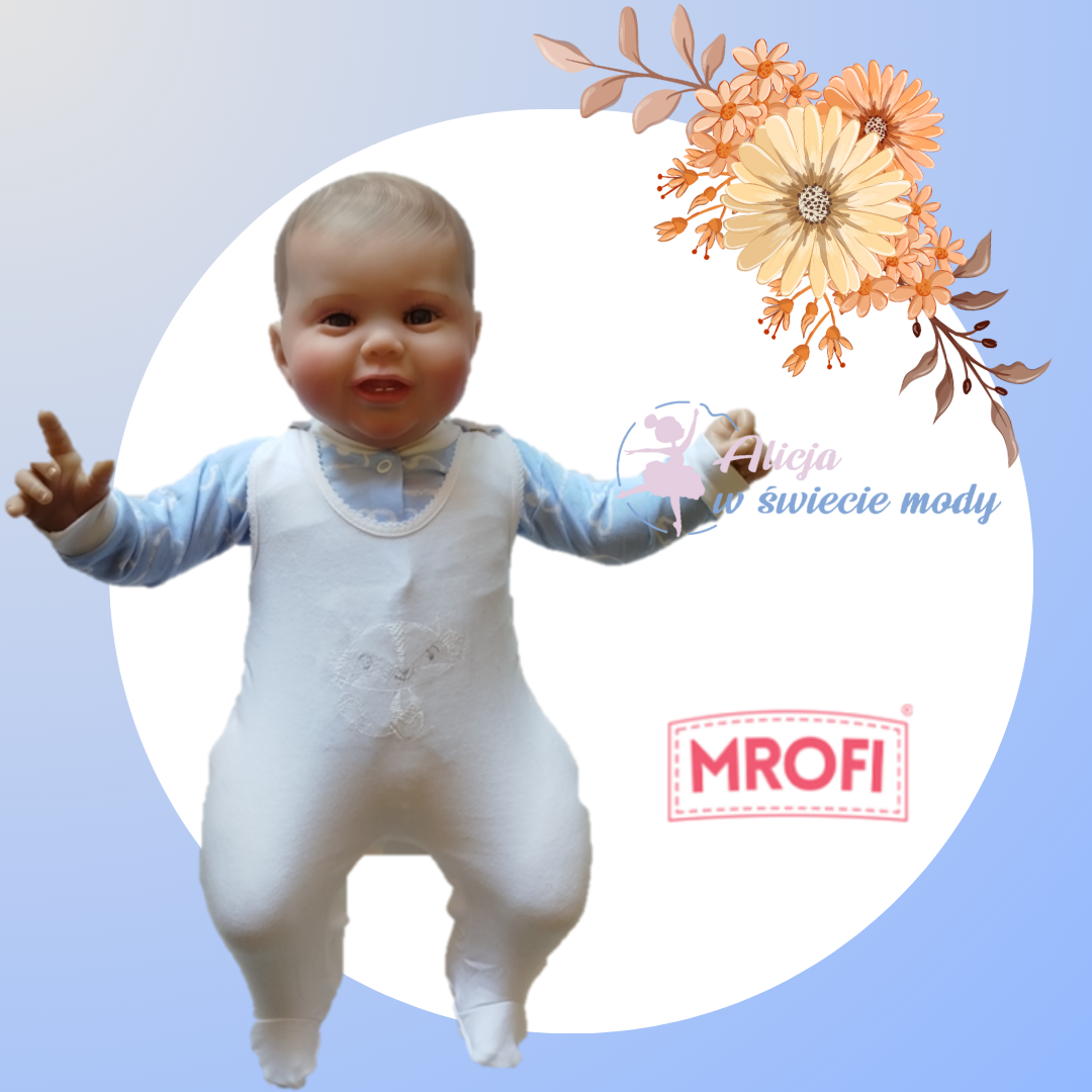 Wygodny śpioch  z motywem  zwierzaka oraz kaftanik z motywem chmurek. Skład materiału to  100% bawełna .Polski producent Mrofi.