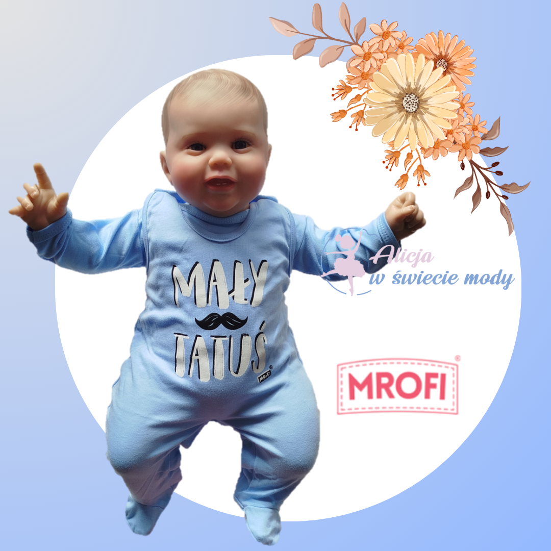 Wygodny śpioch z napisem mały tatuś oraz kaftanik . Skład materiału to 100% bawełna .Polski producent Mrofi.