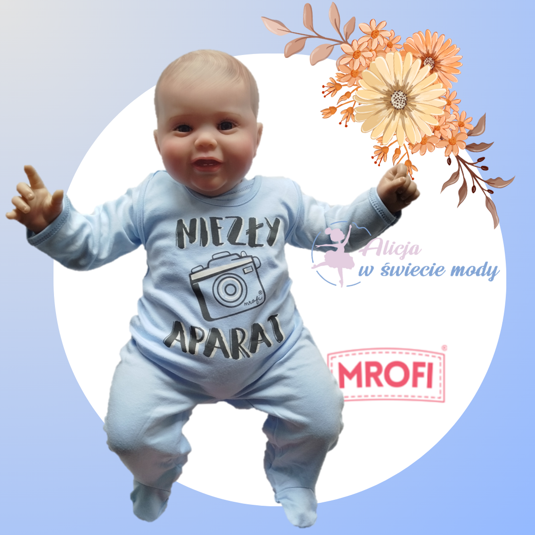 Wygodny   śpioch  z napisem niezły aparat  oraz  niebieski kaftanik  . Skład materiału to  100% bawełna .Polski producent Mrofi.
