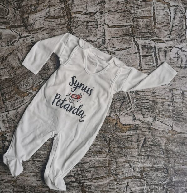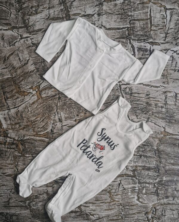 Wygodny kaftanik i śpioszki z zabawnym napisem Synuś petarda. W skład kompleciku wchodzi kaftanik oraz śpioszki. Skład materiału to 100% bawełna. Polski producent Mrofi.