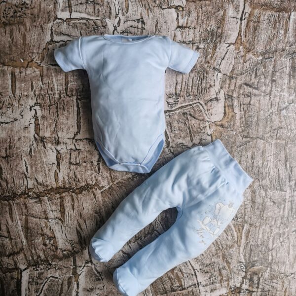 Błękitny komplecik z motywem słonika. . Skład materiału: 100% bawełna . Polski producent Mrofi.