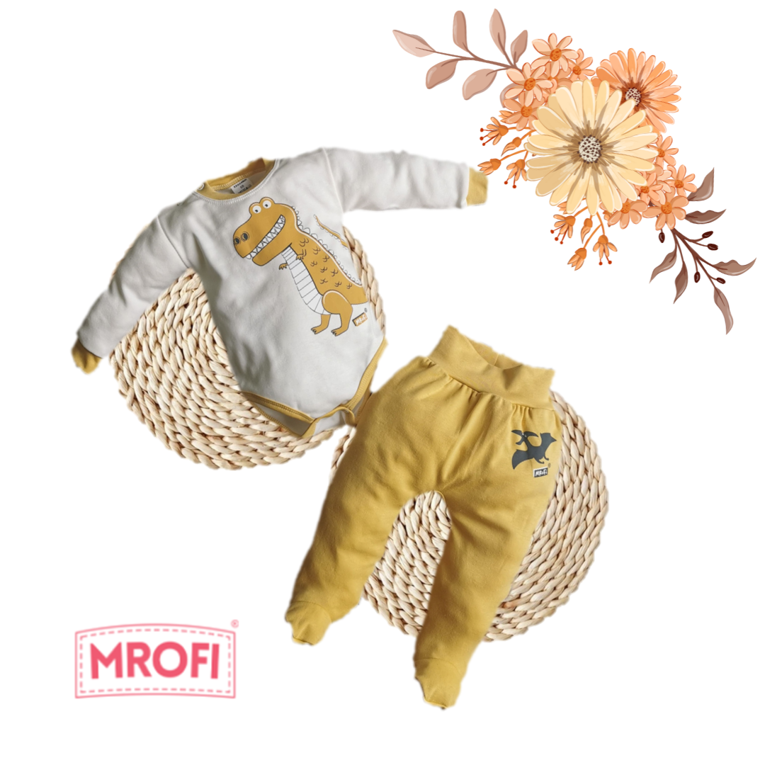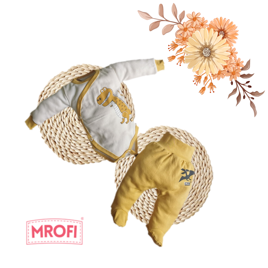 Kompleciki body i półśpiochy z motywem dinozaurów .  W rozmiarze 56 i 62 cm body zapinane kopertowo, rozmiar 68 cm body zwykłe. Skład materiału:  100% bawełna  . Polski producent Mrofi.