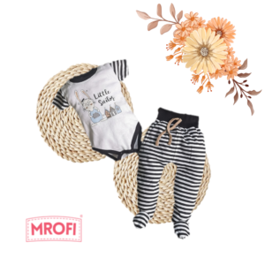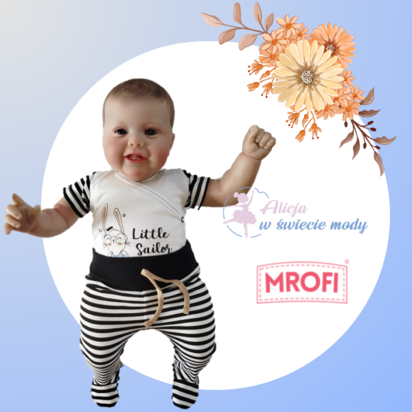 Kompleciki body i półśpiochy z napisem little sailos  z motywem zajączka marynarza.  W rozmiarze 56 i 62 cm body zapinane kopertowo, rozmiar 68  i 74 cm body zwykłe. Skład materiału:  100% bawełna . Polski producent Mrofi.
