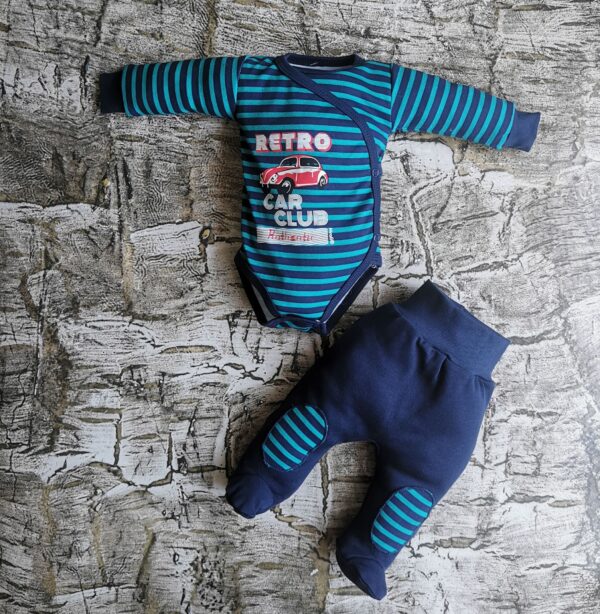 Kompleciki body i półśpiochy z motywem samochodu. W rozmiarze 56 i 62 cm body zapinane kopertowo. Skład materiału: 100% bawełna . Polski producent Mrofi.