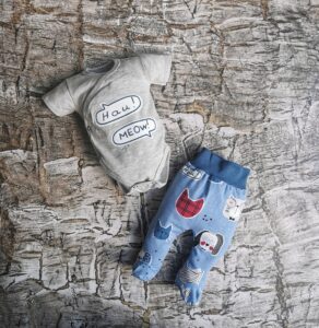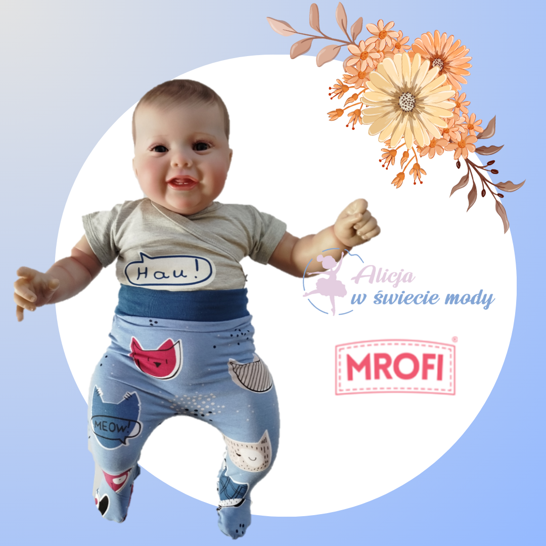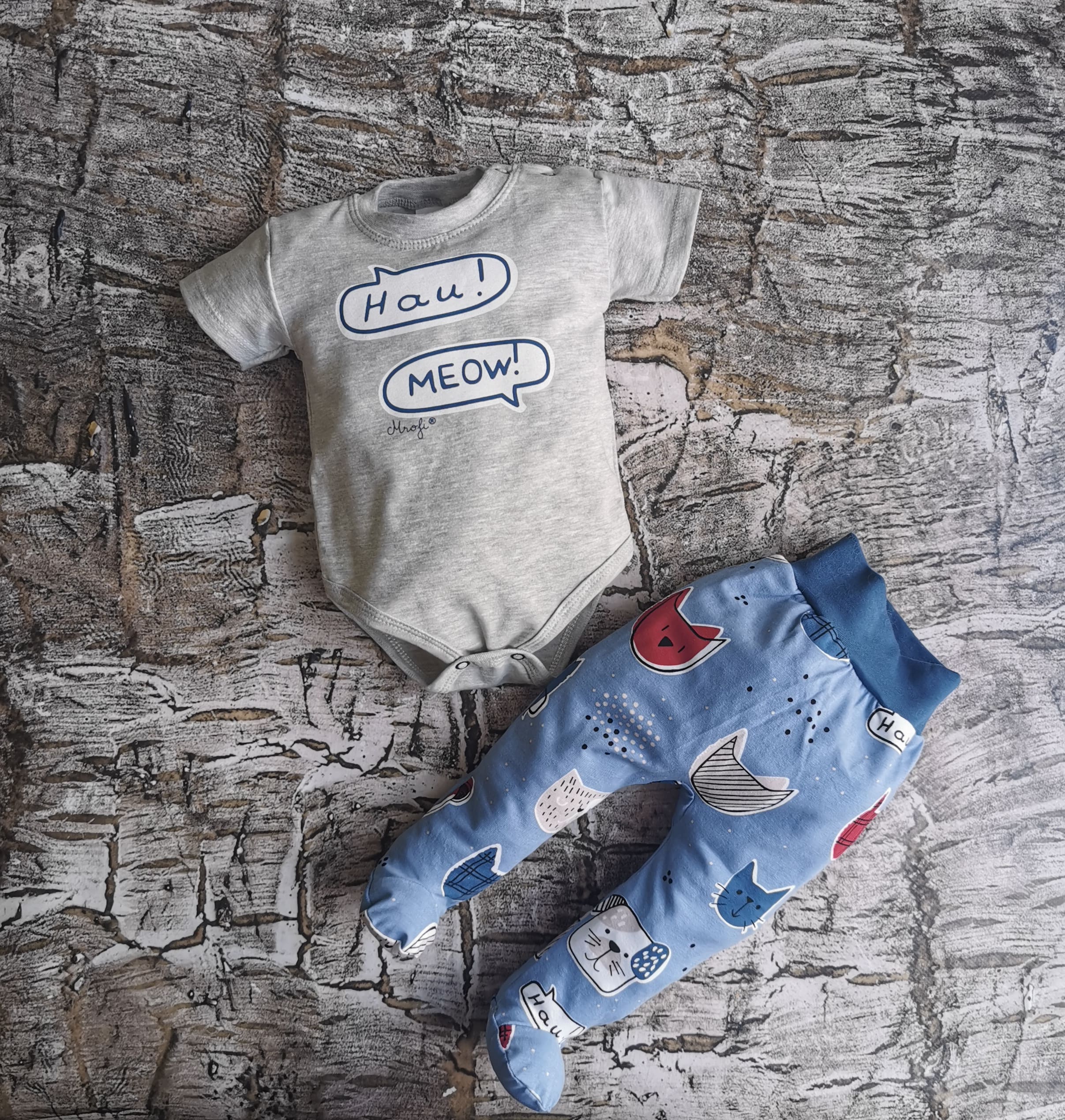 Komplecik z motywem piesków i kotków . Skład materiału: 95% bawełna, 5% poliester . W rozmiarze 56 i 62 cm body w formie koperty, rozmiar 68 cm body zwykłe. Polski producent Mrofi.