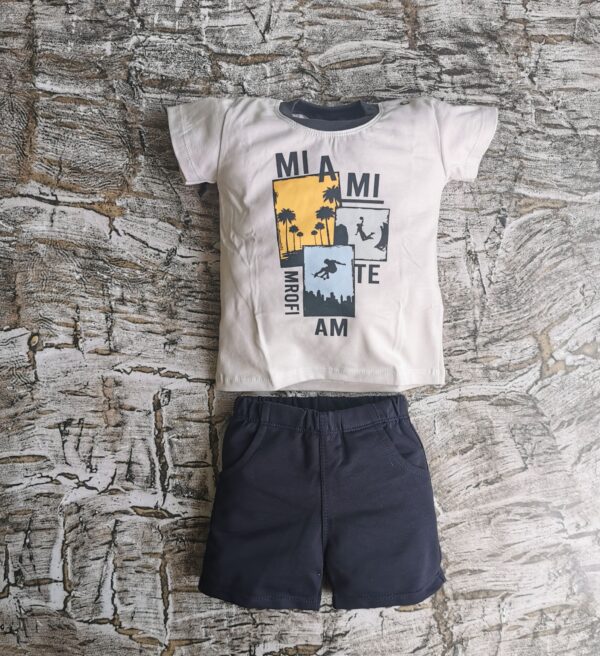 Letni komplecik z motywem palm. Skład materiału: koszulka 100% bawełna, spodenki 95% bawełna 5% elastan. Polski producent Mrofi.