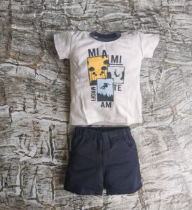 Letni komplecik z motywem palm. Skład materiału: koszulka 100% bawełna, spodenki 95% bawełna 5% elastan. Polski producent Mrofi.