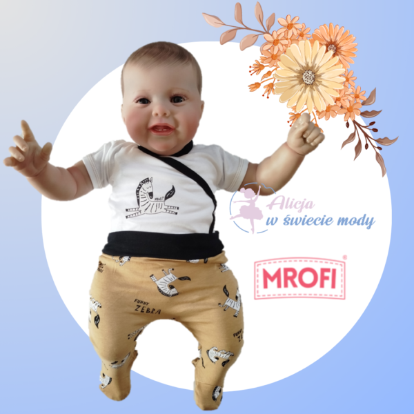 Komplecik z motywem zebry. W rozmiarze 56 i 62 cm występują body kopertowe. Skład materiału:   100% bawełna .  Polski producent Mrofi.