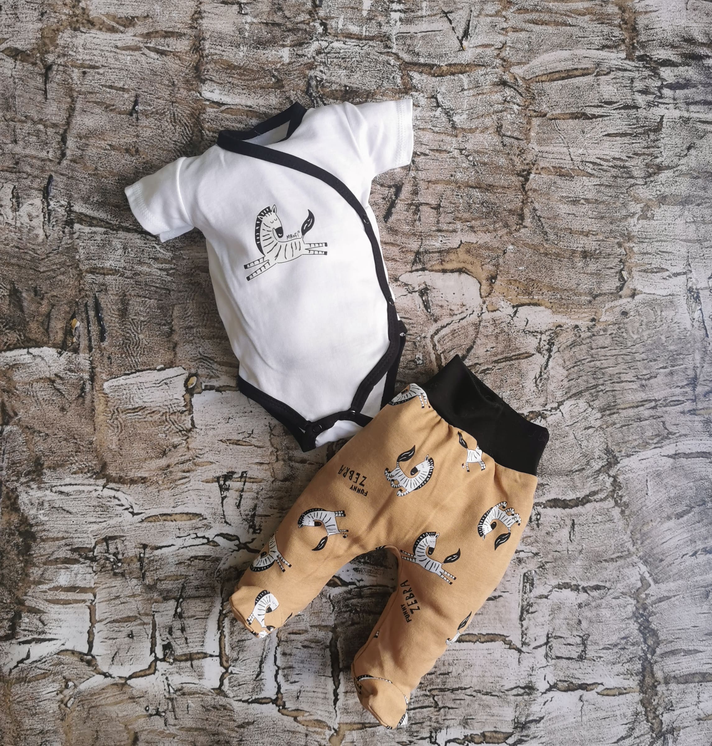 Komplecik z motywem zebry. W rozmiarze 56 i 62 cm występują body kopertowe. Skład materiału:   100% bawełna .  Polski producent Mrofi.