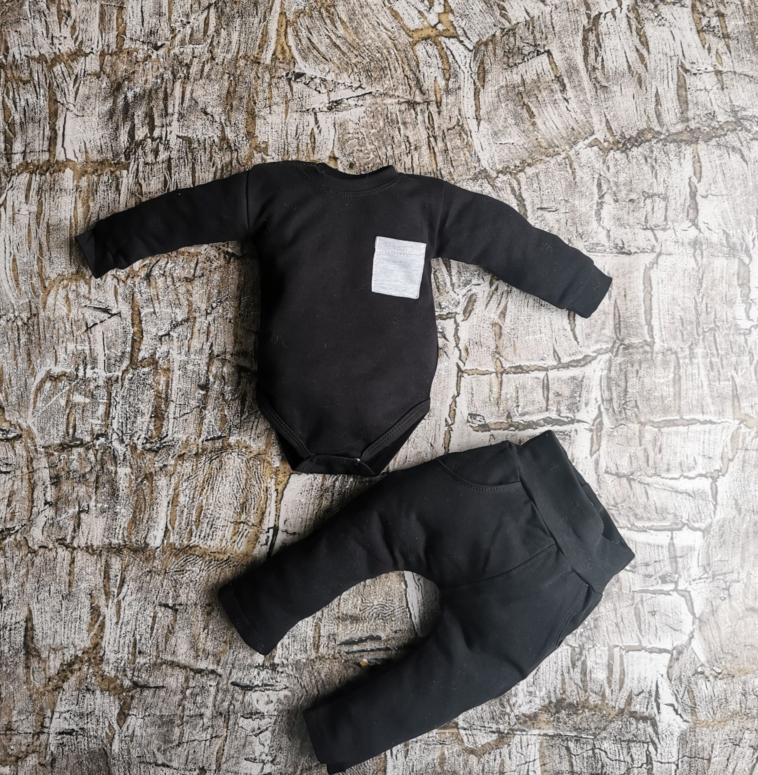 Komplet body i spodnie . Body z szarą kieszonką oraz czarne spodnie . Skład materiału: body 100% bawełna spodnie 95% bawełna 5% elastan . Polski producent Mrofi.