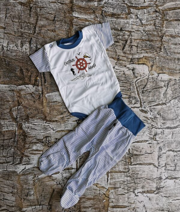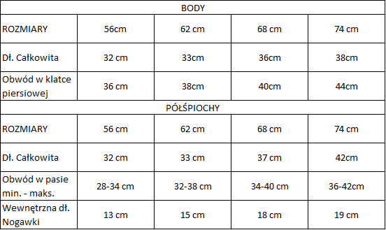 W skład kompleciku wchodzą body oraz bez uciskowe półspioszki. W rozmiarze 68 cm występują body zwykłe. Skład materiału to 100% bawełna. Polski producent Mrofi.