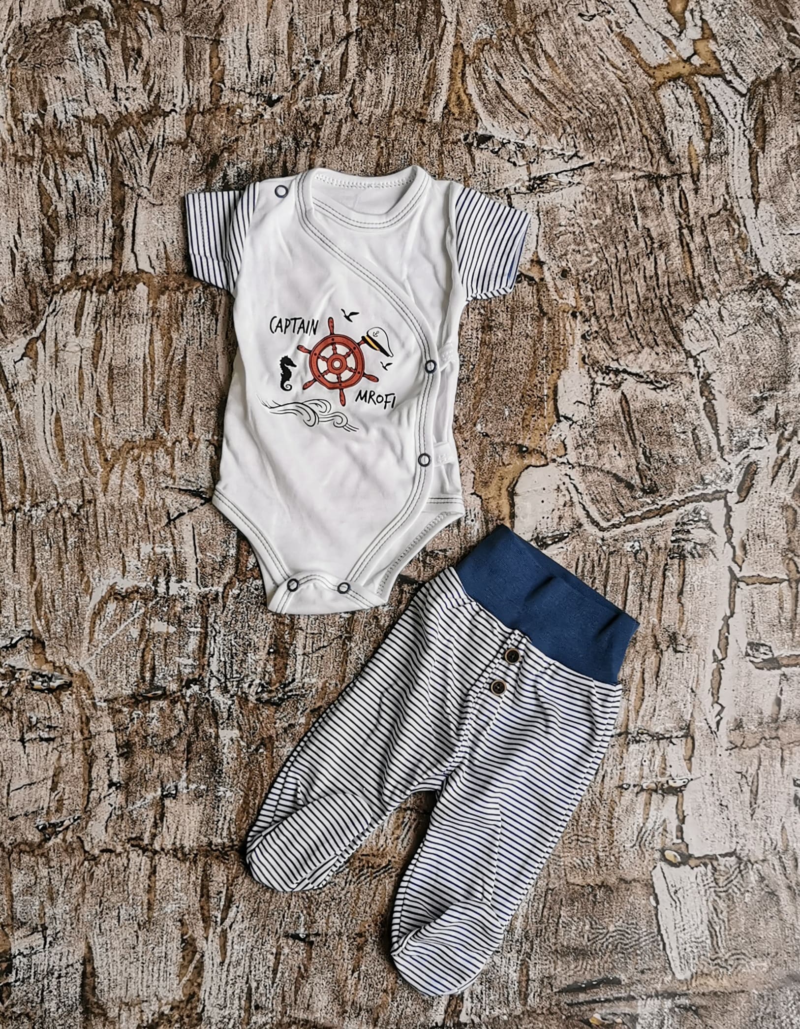 W skład kompleciku wchodzą body oraz bez uciskowe półspioszki. W rozmiarze 68 cm występują body zwykłe. Skład materiału to 100% bawełna. Polski producent Mrofi.