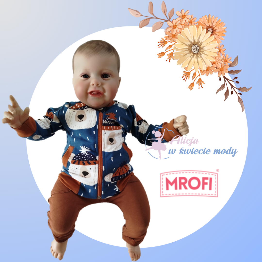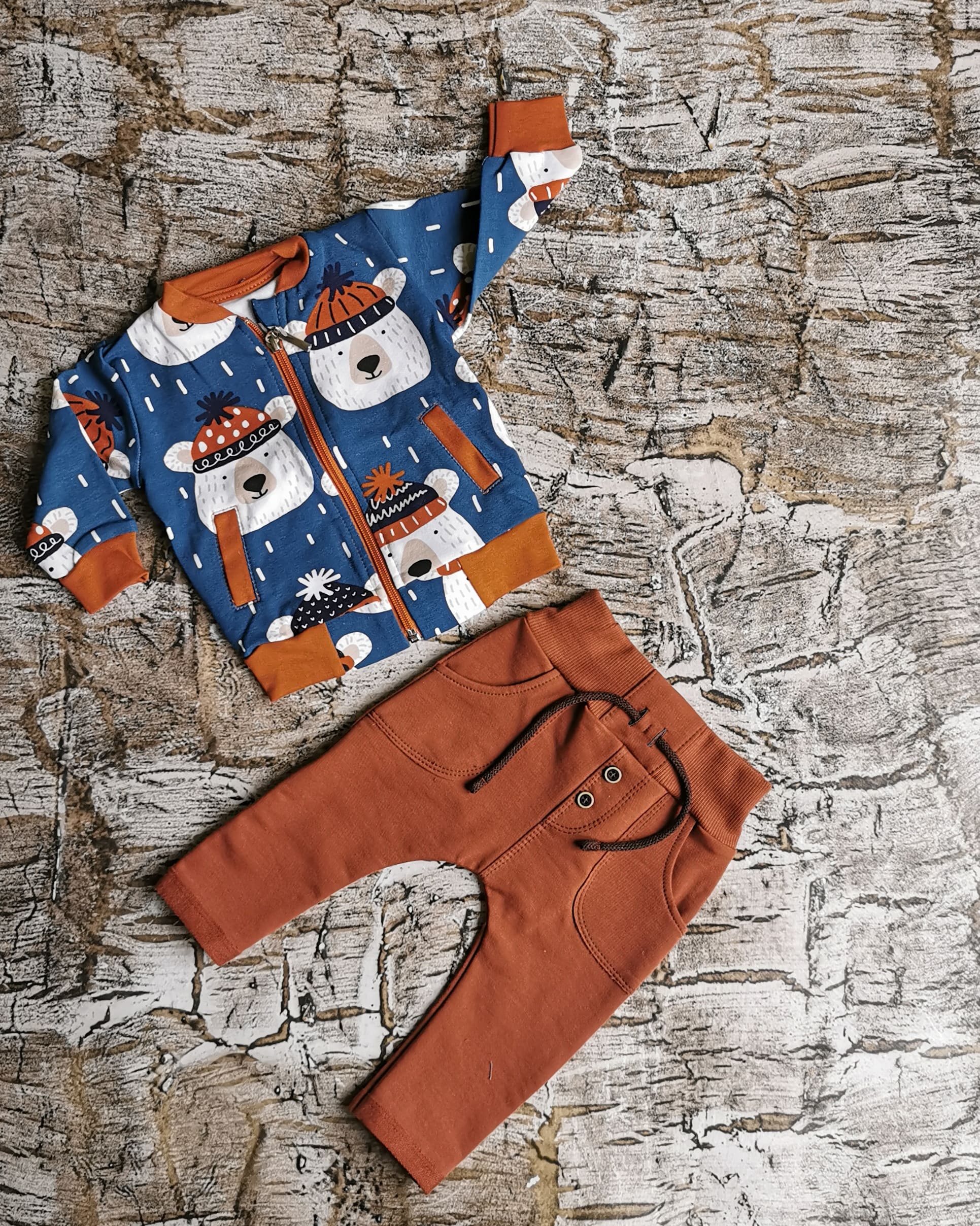 Komplet  z motywem misiaczków w czapeczkach. Bardzo wygodna bluza, z zamkiem błyskawicznym .Zakończenie zamka jest bezpieczne dla dziecka i zapobiega uszczypnięciu. Spodnie w kolorze brązowym z guziczkami i sznureczkiem .Skład materiału to 95% bawełna oraz 5 % elastan. Polski producent Mrofi.