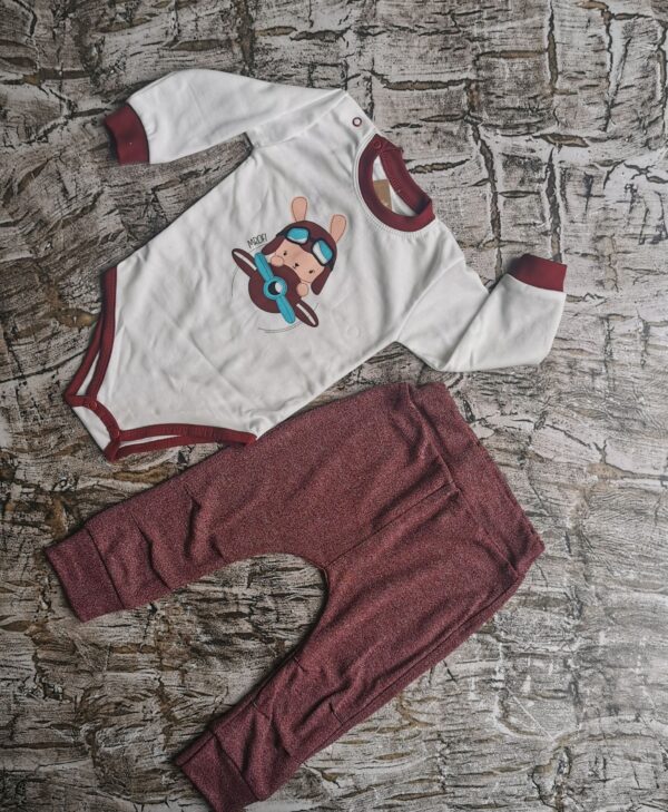 Komplecik samolot. W skład kompleciku wchodzą body oraz spodnie. Skład materiału to : body 100% bawełna, spodnie 80% wiskoza 18% poliester 2% elastan. Polski producent Mrofi.
