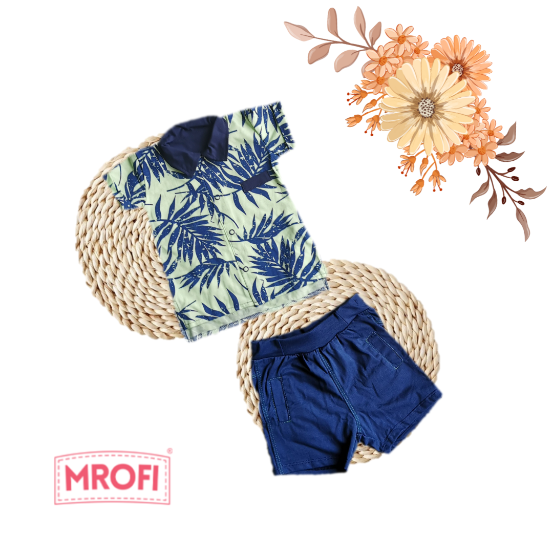 Komplet letni . Koszula chłopięca  z motywem liści oraz granatowe spodenki  . Skład materiału: 100%  bawełna. Polski producent Mrofi.