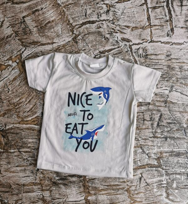 Koszulka chłopięca z motywem rekinów z napisem Nice to eat you . Skład materiału: bawełna 100% . Polski producent Mrofi.