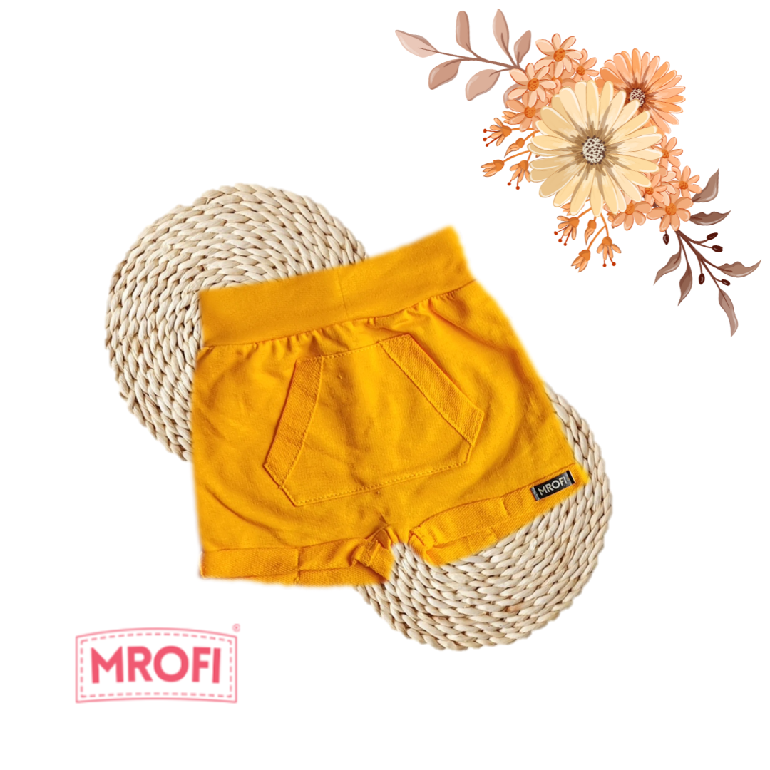 Spodenki w kolorze pomarańczowym z kieszonką kangurką na środku. Skład 100% bawełna, polski producent Mrofi.