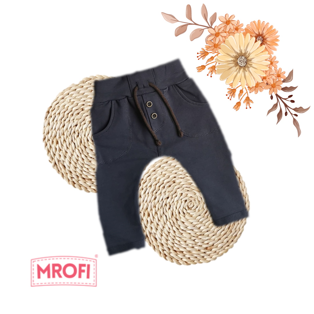 Miękkie i wygodne spodnie dla chłopca. Wykonane przez polskiego producenta Mrofi. Skład materiału: 95% bawełna oraz 5% elastan. Dodatek elastanu wpływa na wygodę noszenia, dlatego spodnie nie uciskają maluszka.