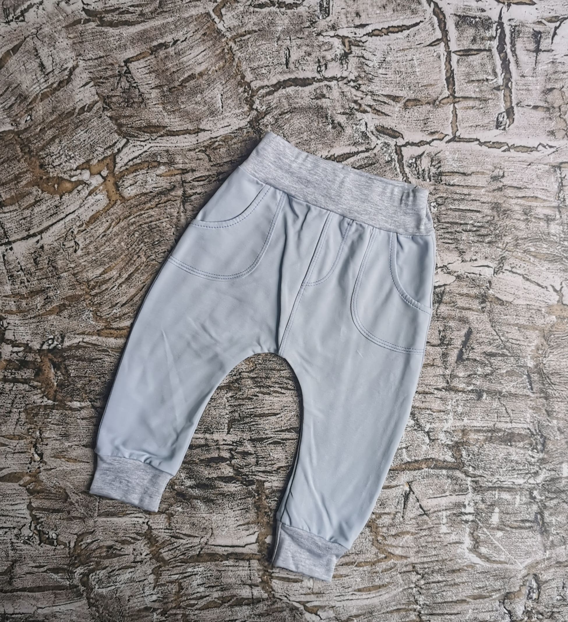 Miękkie i wygodne spodnie dla chłopca niebiesko szare z kieszeniami. Wykonane przez polskiego producenta Mrofi. Skład materiału: 95% bawełna , 5 % elastan.