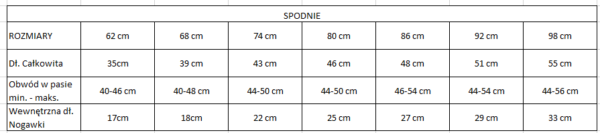 Rozmiar 62 cm, Rozmiar 68 cm, Rozmiar 74 cm, Rozmiar 86 cm, Rozmiar 92 cm, Rozmiar 98 cm